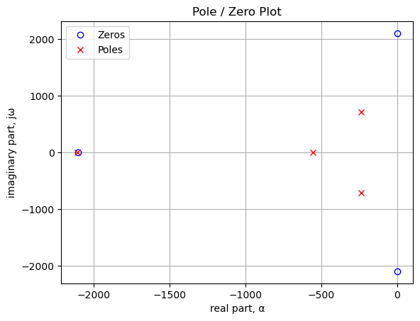 Poles and zeros of the transfer function plotted on the complex plane. The units are in radian frequency.