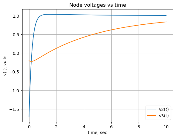 func_node_1_voltage = lambdify(t, node_1_voltage) The plot below shows the node voltages versus time.