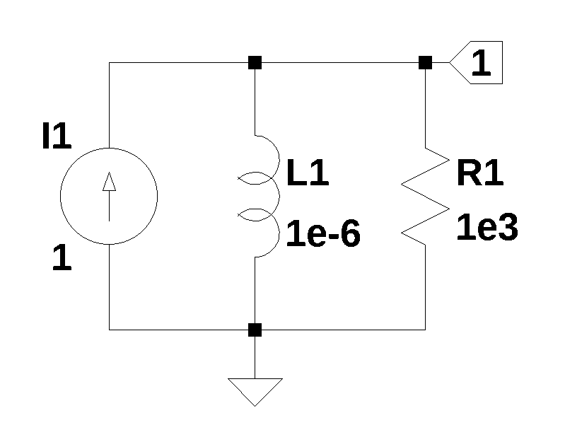 The initial conditions for the inductor is set by the current source \(I_1\). A step function with a value of the step is used. The steady state value, a DC level, of the step is shorted by the inductor and the voltage across the inductor from this contribution is 0.