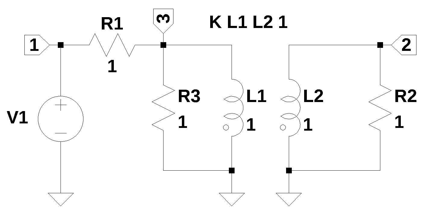 In Figure 9.1, the all values shown in the schematic have been entered as “1”, so the values used in the calculations are now assigned. In the netlist, K1 L1 L2 1 specifies that L1 and L2 are connected by a magnetic circuit. If \(K\) was specified we would calculate the value of \(M\).