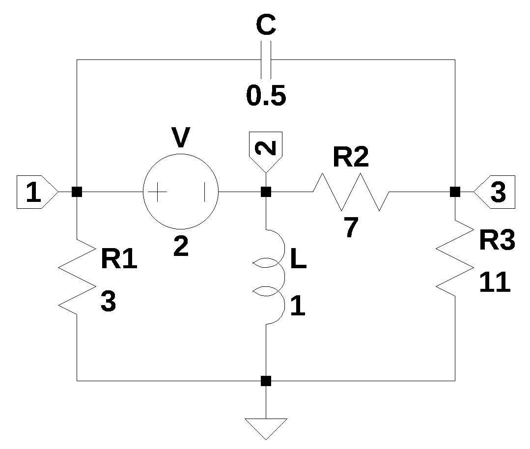 The circuit shown in the schematic below contains three resistors, one capacitor, one inductor and one independent voltage source. The nodes have been numbered and the reference node is indicated by the ground symbol. The schematic was drawn using LTSpice and the netlist was expored and copied into the code cell below.
