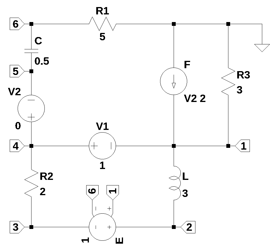 return float(abs(value)), float(arg(value)*180/np.pi)The netlist generated by LTSpice is pasted into the cell below and some edits were made to remove the inductor series resistance and the independent sources are set to their DC values. The componet values are set to 1 for now. Later the phasor quantities will be substituted.