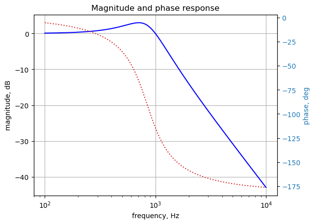 w, mag, phase = signal.bode((a, b), w=x) # returns: rad/s, mag in dB, phase in degThe magnitude response and phase response together form the frequency response of a transfer function, \(H(s)\), which is essential for understanding how a circuit processes different sinusoidal input signals. The frequency response is obtained by substituting \(s = j\omega\) into the transfer function, yielding the complex function \(H(j\omega)\). The magnitude response, \(|H(j\omega)|\), represents the gain or attenuation of the circuit at a specific angular frequency \(\omega\). It shows how the amplitude of the output signal changes relative to the input signal’s amplitude as the input frequency varies. The phase response, \(\angle H(j\omega)\), represents the phase shift (or delay) introduced by the circuit between the output and input signals at that same frequency \(\omega\). These two components are typically plotted separately against frequency on a Bode plot and are crucial for applications like filter design, where specific gain and phase characteristics are required over a range of frequencies.
