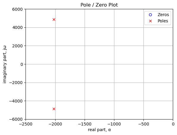 Poles and zeros of the transfer function plotted on the complex plane. The units are in radian frequency.