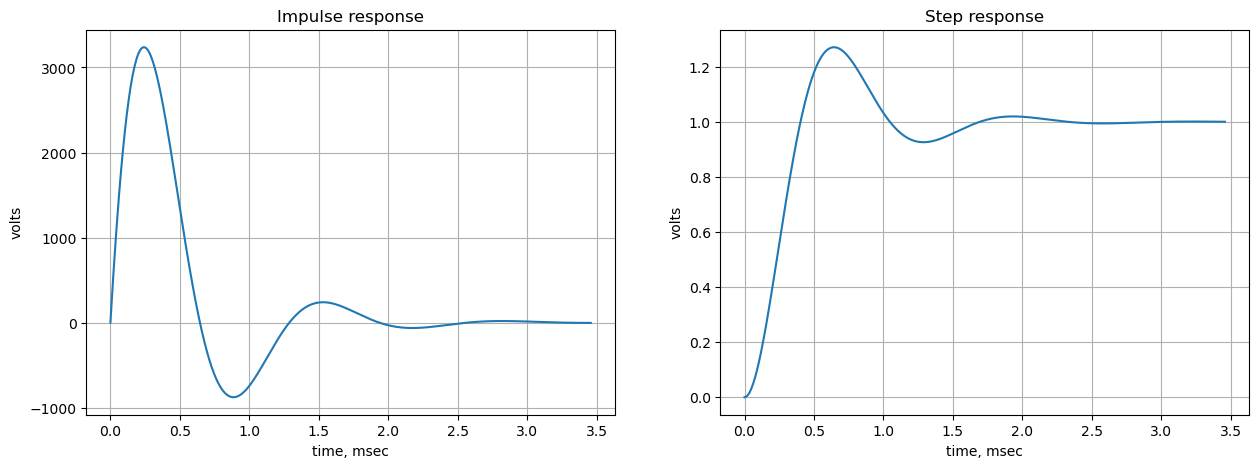 Use the SciPy functions impulse and step to plot the impulse and step response of the system.