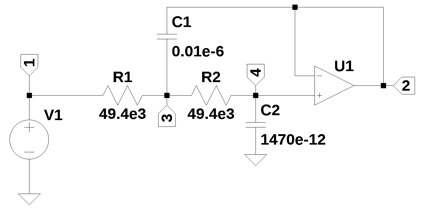 The circuit above is a 2nd order low pass filter from Stout (1976). The schematic of the circuit is shown with each node annotated. The filter shown is being used to illustrate the application of Python to obtain the transfer function, \(\frac {V_2} {V_1}\).