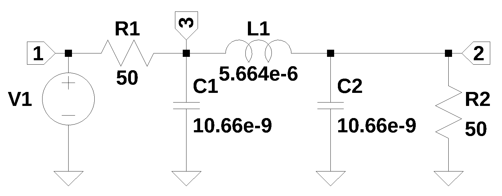 The circuit in Figure 8.1 is an Chebyshev low pass filter, with a 1 MHz cut off frequency, \(50\Omega\) termination and 3 dB of ripple in the pass band. Three dB of ripple in the pass band was designed in so that the transient response would have some ringing. The filter design tool from Marki Microwave (2025) was used to design the filter.