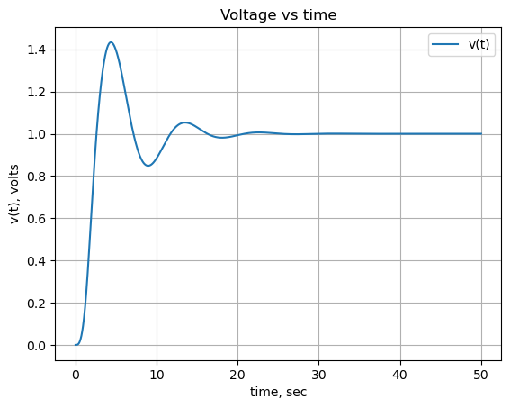 Transient analysis is somewhat more involved than the other types of circuit analysis, primarily because SymPy’s inverse Laplace transform is not very robust and can’t handle complicated expressions. The output equation needs to be simplified by writing some code to put the equation into forms that SymPy can deal with.